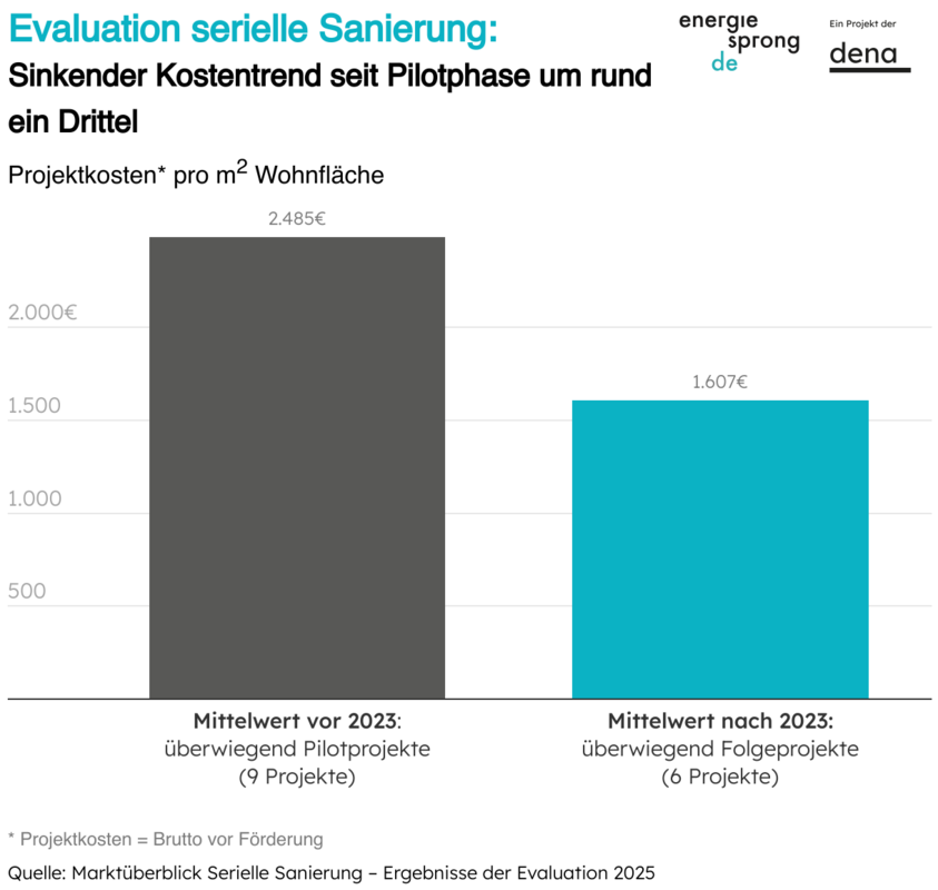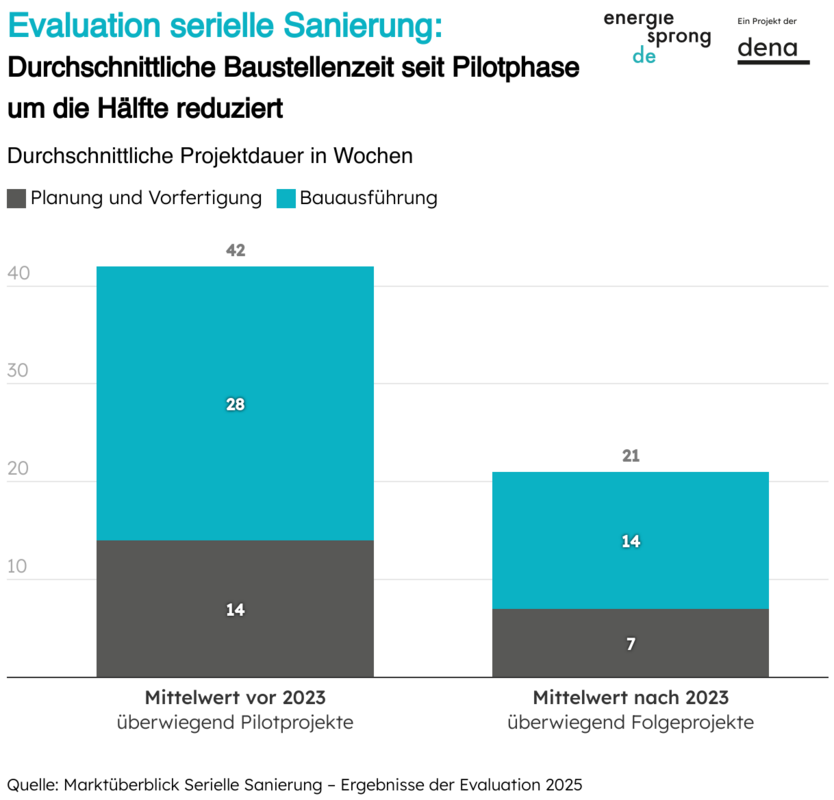 Berlin, 22. Oktober 2025. Serielle Sanierungen sind seit der Umsetzung von mehreren Pilotprojekten wirtschaftlicher und planbarer geworden: Das zeigt eine aktuelle Evaluation des Kompetenzzentrums Serielles Sanieren der dena - Deutsche Energie-Agentur. Die Kosten sanken um rund ein Drittel, Baustellenzeiten halbierten sich von 14 auf durchschnittlich 7 Wochen.