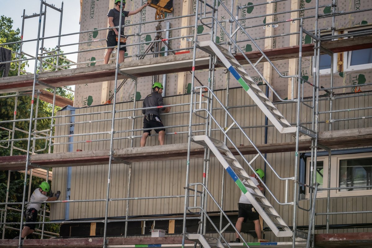 In Köln-Zollstock setzen die Wohnungsgenossenschaft am Vorgebirgspark, teamtektura und Korona Holzbau das zweite serielle Sanierungsprojekt gemeinsam um. In unmittelbarer Nachbarschaft des ersten Pilotprojekts werden drei Mehrfamilienhäuser mit insgesamt 30 Wohnungen in bewohntem Zustand auf den klimaneutralen NetZero-Standard gebracht.