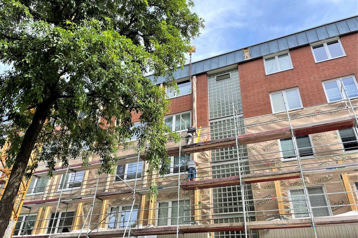 Da es sich um das zweite serielle Sanierungsvorhaben in gleicher Konstellation handelt, profitiert das Projekt von den Best Practices und Lessons Learned, die im ersten gemacht wurden. Um die ökologisch, ökonomisch und technisch beste Lösung für das Gebäudeensemble zu finden, hat man im Vorfeld eine Machbarkeitsstudie erstellt und verschiedene Optionen durchgespielt. So wurde unter anderem untersucht, ob die bestehende Spar-Klinkerfassade abgetragen werden muss oder unter der neuen Gebäudehülle verbleiben kann. Auch der etwaige Erhalt der Bestandsfenster, die durch zusätzliche Fenster mit Zweifachverglasung zu einem Kastenfenster-System kombiniert werden, war Teil der Studie.