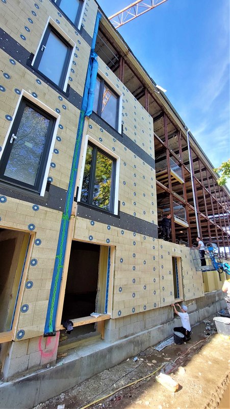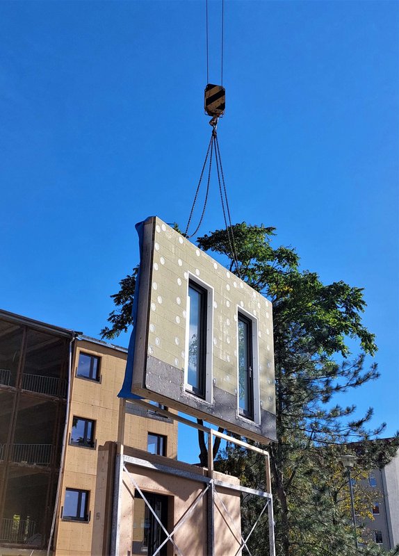 - Vorgefertigte Fassadenelemente in Holzrahmenbau inklusive: