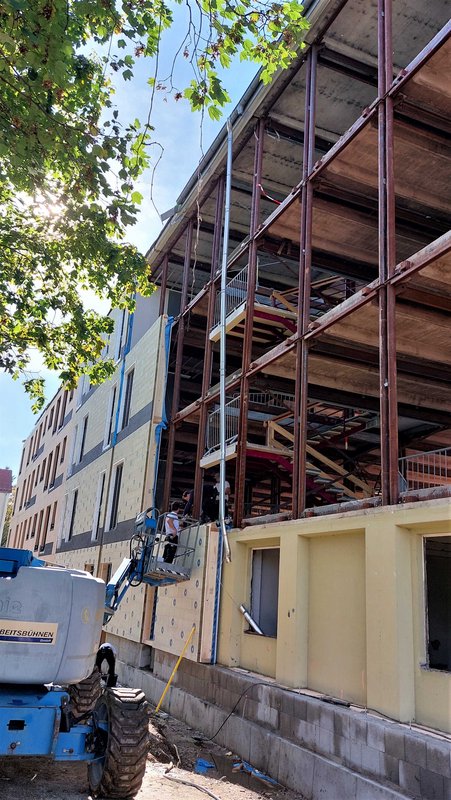 In Pirna setzen basis d und Holzbau Lepski die erste serielle Sanierung in Sachsen um. Das Projekt hat in vielerlei Hinsicht Vorbildcharakter: Ein ausgedientes Finanzamt wird mit vorgefertigten Holzfassaden auf ein zukunftsfähiges Energieeffizienzniveau gebracht und darüber hinaus in ein Mehrgenerationenhaus mit 39 Wohnungen umgewandelt. Photovoltaikmodule auf dem Dach versorgen die Mieterinnen und Mieter mit günstigem Solarstrom. Die Wärmeversorgung erfolgt mit Geothermie.