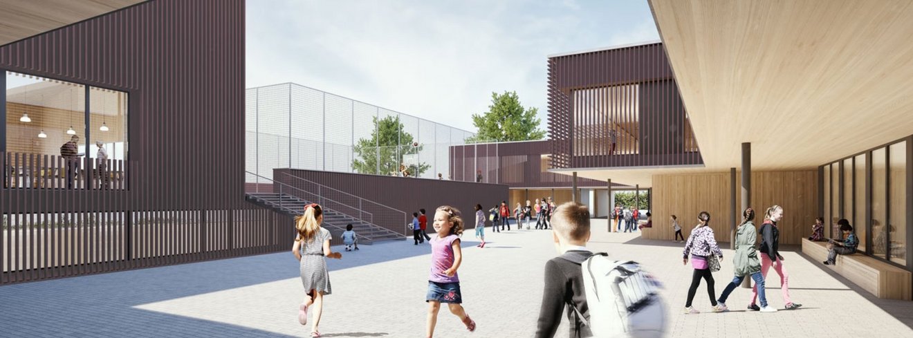 Die Schule am Hang ist ein gelungenes Beispiel dafür, wie sich Bestandsgebäude und Neubauten harmonisch miteinander verbinden lassen. Die alten Schulgebäude werden mit einem neuen, zweigeschossigen Gebäudeensemble verknüpft. Die alte Turnhalle wird aufgestockt. So entsteht Platz für ein „Kinderrestaurant“ im Obergeschoss. Daneben wird eine zweite Turnhalle gebaut. Das Highlight ist hier ein Spielplatz auf dem Dach. Zwischen den Gebäuden laden Schulgärten zum Gärtnern und Entspannen ein.